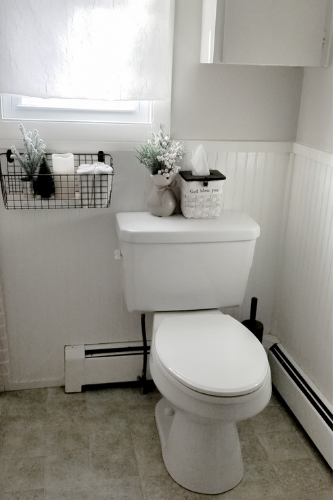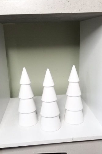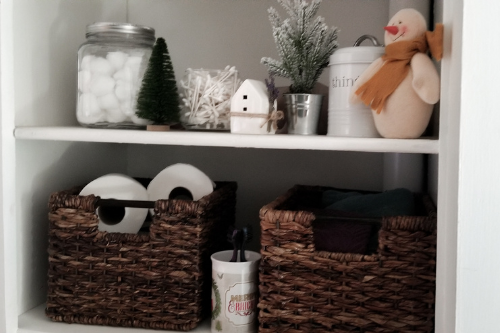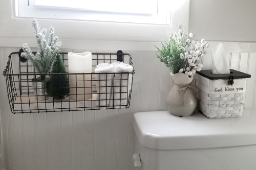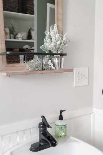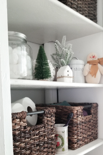 Do you put Christmas decorations in your bathroom? I don’t always, but this year I really wanted to do a little something. We have open shelving in our bathroom, so I just added a few trees and some greenery just to make it a little festive but keep up the theme of the neutral Christmas decor.