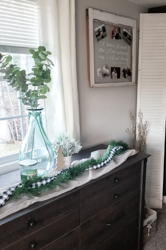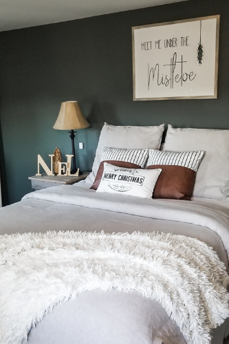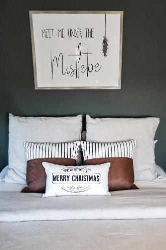 I kept it fairly simple in our master bedroom as well. Just a festive pillow on the bed, a sign above the bed that I DIYed and a few decorations on the bureau. Nothing too crazy.