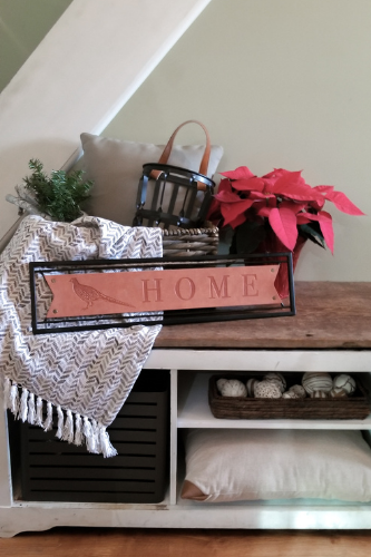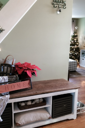 My entryway is small. I basically just have the old TV stand that I DIYed into an entry bench. It’s mostly convenience for our home, but I still try to make it feel inviting by decorating the bench a bit and hanging some lit garland wrapped with one of my DIY knit garlands.