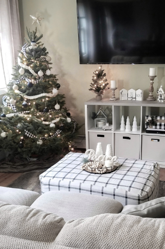 First up is the living room. Of course, because it’s the coziest! I DIYed a lot of my decor this year including the knit garland, these cozy yarn trees and the faux clay ornaments! I really love all the ceramic decorations and the classy look some sparkly decorations can bring, but I also wanted to make sure my living room felt cozy. So, I added fuzzy throw pillows and blankets in various spots, I got stockings that are knitted and have faux fur, I tried to work in some of the black and white buffalo check pattern, and incorporated yarn DIYs.