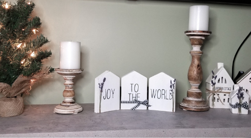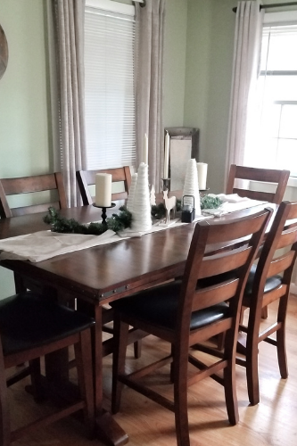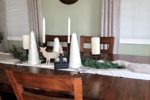 My dining room is connected to my living room. So my goal was to keep it classy, but also incorporate some of the cozy vibes from the living room. On my dining room table, I layered table runners, using a chiffon satin table runner on top and then added some garland and candles. To bring in the cozy vibes, I added some of my yarn trees and a couple wooden decorations I snagged in the dollar spot at Target.