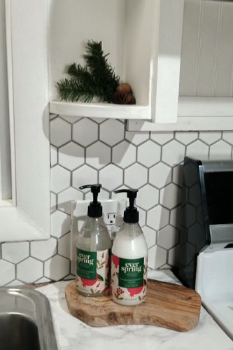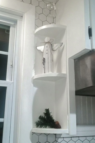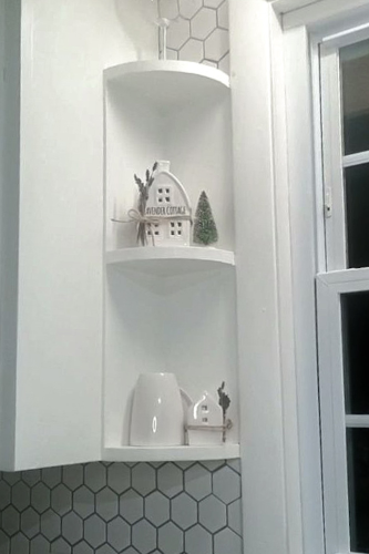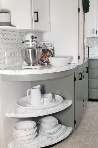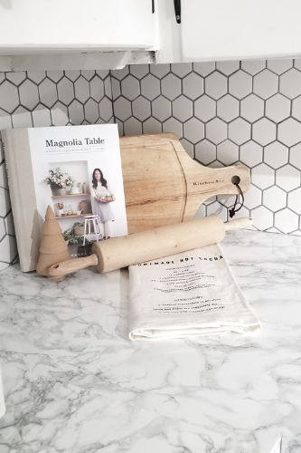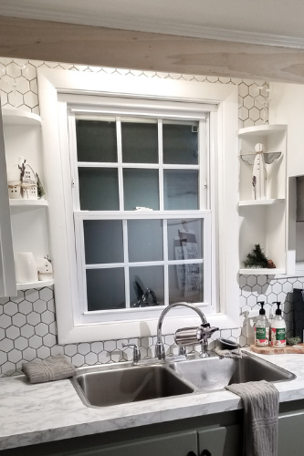I’ve been working on redoing our kitchen. Recently, I painted the cabinets and updated the hardware, put contact paper on our countertops, built an accent cabinet door, put contact paper on our fridge, updated the kitchen table, and I just finished my hexagon backsplash. I still want to redo the floors and create a fun accent wall where the table is. With everything so new and fresh, I wanted to keep it simple and fairly classy in here. So I just added small touches here and there. I put ceramic houses on the small shelves and added a few little trees.